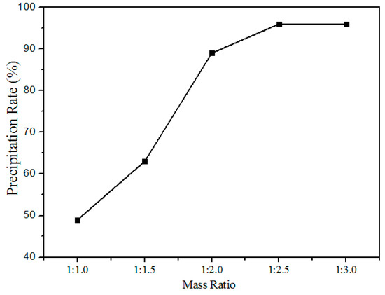Figure 11 shows the relationship between the precipitation rate and oxalate addition (the mass ratio of rare earth elements to the oxalate addition) at pH values of 1.5. The precipitation rate increased with the increased addition of oxalates, after the mass ratio reaches 1:2.5 the variation in the precipitation rate is insignificant. Hence, the optimum mass ratio chosen was 1:2.5.