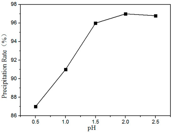 Figure 12 shows the precipitation ratio of rare earths at different pH values. It is shown that the precipitation rate of the rare earths increased with increasing pH. Above pH 2.0, the RE was almost completely precipitated. Therefore, the optimum pH value is 2.0.