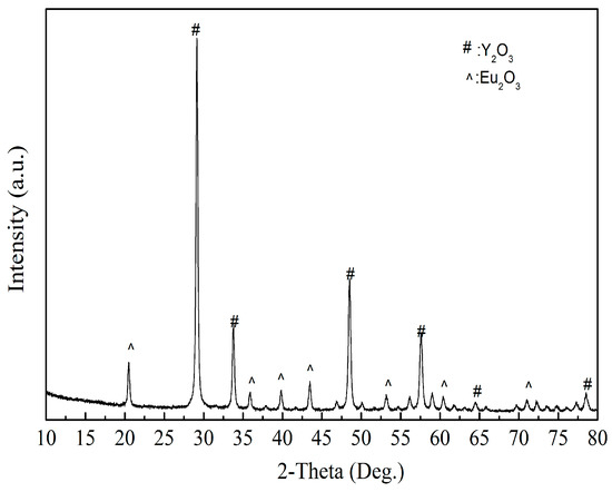As shown in Figure 13, the product obtained by calcining the oxalate’s precipitation of RE has an irregular crystal shape with an average length of 5 μm. The result of XRD analysis (Figure 14) shows that the main crystalline phase of the REOs is Y2O3 and Eu2O3. The diffraction peaks of the REOs are sharp without any impurity peaks, indicating that the product was a high purity material of Y and Eu. The composition of the product is listed in Table 3, indicating the total content of Y2O3 and Eu2O3 is 99.84%, and the products can be reused to synthesize red phosphors directly without separating Y2O3 and Eu2O3.