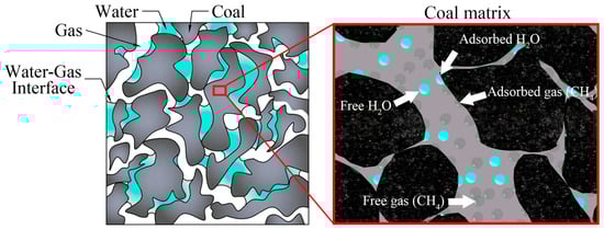 Coal is a porous medium containing a fracture network. Following implementation of hydraulic measures, the pores and fractures within a coal particle are filled with water and gas, forming a three-phase medium composed of the coal matrix, water, and gas, as shown in Figure 1. Water occurrence in coal has two kinds of phases. When the moisture content of coal is small (less than 0.1%), water exists in coal matrix in the form of vaporous water [23]. When the moisture in coal exceeds a critical level (balance moisture), vaporous water in the coal matrix reaches saturation, so other water exists in the form of liquid water. Because liquid water is unable to overcome the interfacial tension and go into micropores, liquid water can only invade the outer surface of the coal and the surface of mesopores and macropores [24]. Under the general geological conditions in Chinese coal mines, the moisture contents of coal reservoirs are about 1%–3%, which is sufficient to reach gas saturation. In the process of hydraulic measures implementation, a large amount of water invades the coal. The vaporous water and gas occurrence in the coal matrix and the liquid water and free gas existing in pores and fractures make coal a complex three phase medium.