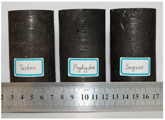 To study the general applicability of the failure criterion, three types of Chinese coal samples were used in these experiments, taken respectively from the No. 7 coal seam of Songzao mine in Chongqing, the No. 15 coal seam of Pingdingshan mine in Henan, and the No. 3–5 coal seam of Tashan mine in Shanxi, as shown in Figure 2. These coals have different hardnesses, ranging from soft to hard, respectively. The specifications of the samples, including porosity, pore size etc., are summarized in Table 1. Porosity was measured by an AP-608 automatic burdening pressure permeameter (Coretest, Morgan Hill, CA, USA) under 6.2 MPa circling pressure, and the average pore size was measured by an AutoPore IV 9500 type automatic mercury porosimeter (Micromeritic, Norcross, GA, USA). According to the standard recommended by the International Society for Rock Mechanics, the coals were processed as cylindrical samples of 50 mm diameter and 100 mm height.