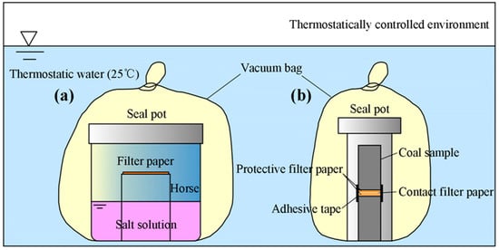 The matrix suction measurement of the coal samples: Two samples, having been soaked for the same time, were placed one on top of the other with three layers of Whatman No. 42 filter paper between them: the middle filter-paper layer was 4 cm in diameter and used to test moisture content; the upper and lower layers were 5 cm in diameter and protected the middle layer from contamination. The seam between the two samples was taped with insulating tape and they were placed in a sealed tank at a constant temperature water (25 °C), as shown in Figure 3b, and allowed to stand for 10 days. The moisture content of the filter paper was then measured.