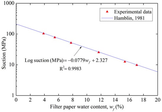 The measured moisture contents of filter paper are shown in Table 3. The filter paper moisture contents and the corresponding suction values of NaCl solution are drawn into the logarithmic coordinates for linear fitting. The calibration curve for Whatman No. 42 filter paper that is suitable for high suction values and filter paper moisture contents of less than 20% is shown in Figure 4, and the calibration results are consistent with the measurement results of Hamblin [32].