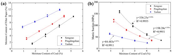 The moisture content of each filter paper for coal samples is shown in Figure 5a. Equation (18) gives the calibration curve for Whatman No. 42 filter paper that is suitable for measuring moisture contents of less than 20%. The matrix suction of the coal samples under different moisture contents was obtained by substituting the values of the moisture content of each filter paper into this calibration curve.