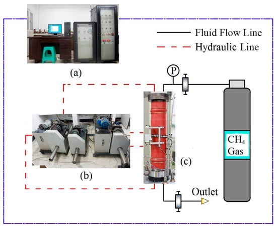 Experiments were performed using an in-house equipment design with a RLW-2000M microcomputer-controlled coal and rock rheometer (Chaoyang Instrument Factory, Changchun, China). The equipment comprised loading facilities, a control system, a triaxial pressure chamber, a confining pressure system, a pore water pressure system, temperature control, and an output printing device. The control system employed an EDC (Externe Digital Controller) all-digital servo control device (DOLI, Munich, Germany) (Figure 6a), which could separately control three independent closed-loop systems: those of axial compression, confining pressure, and pore pressure. The loading system used a servo motor and ball-screw loading system (Figure 6b), which could perform various deformation experiments for extended periods under load control or displacement and deformation control. The maximum axial load was 2000 kN; the load resolution was 20 N; the maximum gas seepage pressure was 20 MPa; the gas pressure precision was 2%. Axial and lateral strains were measured by extensometers (Figure 6c).