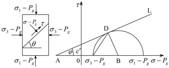 Under the stress state shown in Figure 7, the plane stresses (σ − Pg) and τ are determined by the stress circle based on stresses (σ1 − Pg) and (σ3 − Pg), and Equation (22) can be obtained: