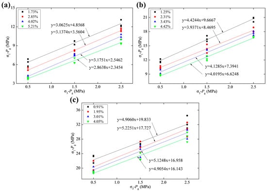 Arranging the difference between the confining pressure and the gas pressure (σ3 − Pg) as the abscissa and the difference between the strength and gas pressure (σ1 − Pg) as the ordinate, and applying a linear fit to data for the same moisture content gave the results as shown in Figure 8.