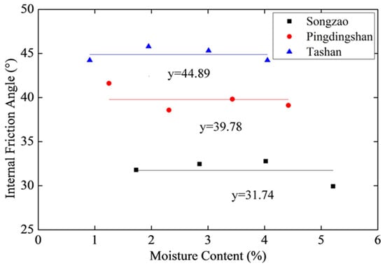 These calculations show that the internal friction angle hardly changes with moisture content, as shown in Figure 9. The coal samples from Songzao were softest and the internal friction angle was 31.74°; Pingdingshan coal, with an intermediate hardness, gave a value of 39.78°; the hardest coal from Tashan gave 44.89°.