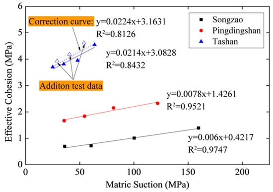 The deviations are small for soft coal from Songzao and Pingdingshan, and the deviation is larger for Tashan hard coal, which illustrates this theory is more suitable for soft coal. The internal friction angle ϕ and effective cohesive force c′ are obtained by proper fitting of the experimental data. The data of the internal friction angle shown in Figure 9 is uniformly distributed on both sides of the fitting straight line, and the fitting result is good. However, the data linear fitting of effective cohesive force in Figure 10 shows a significant deviation, and it is due to the small matrix suction range of Tashan coal samples. In order to reduce the deviation resulting from limited experiment levels, additional experiments were conducted to increase the experiment levels of 1.41%, 2.45%, 3.52% moisture contents and carry on the data fitting again. The result is shown in Figure 10, and deviation is reduced slightly, as shown in Figure 11c and Figure 12c.