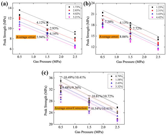 Relationship between peak strength and gas pressure: (a) Songzao; (b) Pingdingshan; and (c) Tashan.