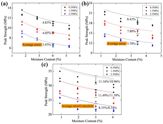 Relationship between peak strength and moisture content: (a) Songzao; (b) Pingdingshan; and (c) Tashan.