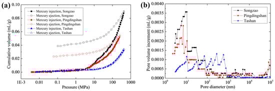 (a) Mercury intrusion experiment curves; (b) Distribution curves of pore volume of coal samples.
