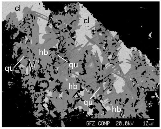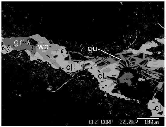 BSE image showing acicular grains of quijarroite (qu) in the matrix and intergrown with watkinsonite (wa) and clausthalite (cl), and associated with grundmannite (gr).