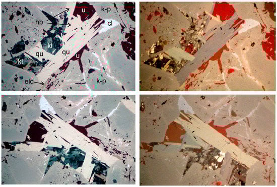 Reflected light digital images of quijarroite (qu) in association with hansblockite (hb), clausthalite (cl), krut’aite-penroseite (k-p), klockmannite (kl), umangite (u), and eldragόnite (eld). Horizontal field of view is 200 µm. Left images: one polarizer; right images: Partly crossed polarizers.