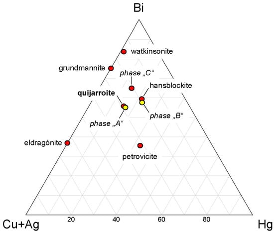 (Cu + Ag)−Hg−Bi (% apfu) ternary diagram showing the mean compositions of minerals of the Cu−Hg−Pb−Bi−Se system from El Dragón. Note the correspondence of quijarroite with phase “A” and hansblockite with phase “B” within analytical error. Data sources: [4,5], this paper and [2], for phases “A” and “B”.