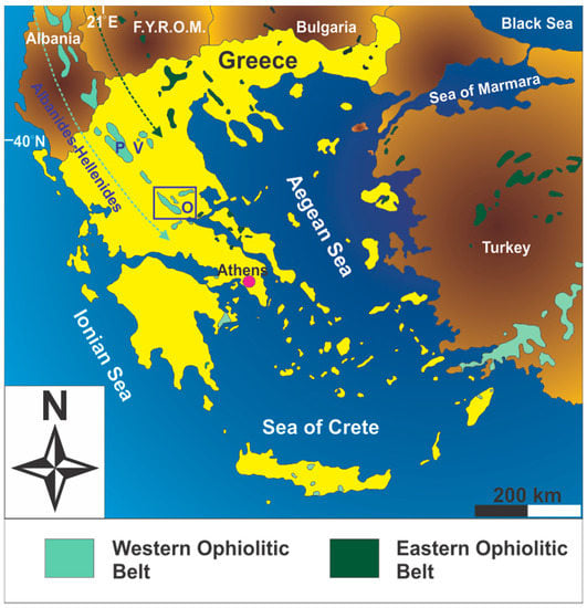 Distribution of ophiolites in the southernmost part of the Balkan Peninsula (modified after [30]). Key to lettering: V = Vourinos; P = Pindos; O = Othris (also marked by the open square). The initials F.Y.R.O.M. stand for Former Yugoslav Republic of Macedonia.