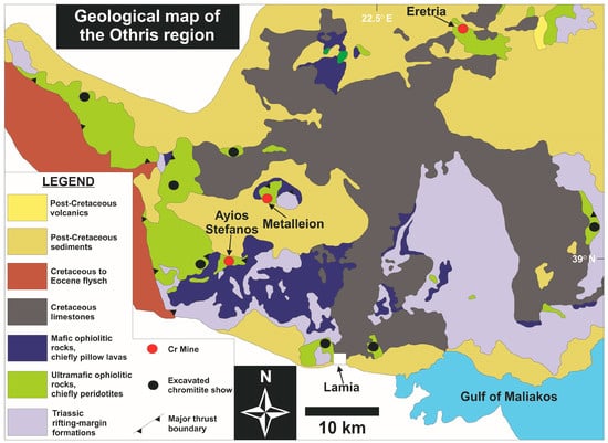 - Rassios, A.; Konstantopoulou, G. Emplacement tectonism and the position of chrome ores in the Mega Isoma peridotites, SW Othris, Greece. Bull. Geol. Soc. Greece 1993, 28, 463–474. [Google Scholar]
