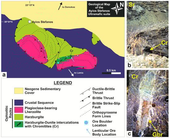 (a) Geological map of the Ayios Stefanos region illustrating the bowing of structures synchronous to ‘hot’ nappe emplacement [36]; (b) The serpentinized dunite-harzburgite ductile-brittle thrust zone that separates the peridotite nappes in the Ayios Stefanos area; (c) A gabbroic dyke in the chromitite boulder within the quarry talus (this figure also appears in [36]). Abbreviations (in order of appearance): Cr = chromitite gallery (in b) and chromitite (in c); Sr = serpentinite; Gbr = gabbroic dyke.