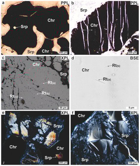 Photomicrographs illustrating the petrographic characteristics of the Ayios Stefanos chromitites. (a) Reddish lobate Cr-spinel; (b) Chromian spinel displaying pull-apart‒like texture (marked by the white arrows); (c,d) Rutile exsolutions developed in three crystallographic orientations [Rt(a), Rt(b), Rt(c)]; (e) Bastite cut by late serpentine veins; (f) Serpentine showing hourglass texture. Abbreviations (in order of appearance): Chr = Cr-spinel; Srp = serpentine; Rt = rutile; Srp1 = early serpentine; Srp2 = late serpentine; PPL = plane polarized light; XPL = crossed polarized light; BSE = back scattered electron (image).