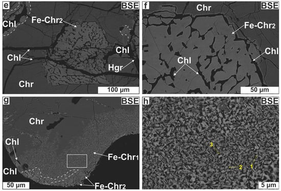 Photomicrographs illustrating Cr-spinel textural modification. (a) Chromian spinel surrounded by a dark grey rim; (b) The same image in XPL showing that the rim is surrounded by chlorite; (c) Chromian spinel almost entirely replaced by a bright (spinel) phase; (d) Porous spinel for Cr-spinel substitution; (e,f) Spongy spinel displaying elongation of pores; (g) Cr-spinel with a boundary made up of spinel mixed with Mg-silicates; (h) Close up of the white, open square in (g) illustrating the oriented Mg-silicate lamellae micro-texture in Cr-spinel. The intersection of Mg-silicate needles in three directions is also marked. Abbreviations (in order of appearance): Fe-Chr = altered spinel; Chl = chlorite; Fe-Chr1 = lamellae-rich spinel; Fe-Chr2 = porous spinel; Hgr = hydrogrossular; the rest as in Figure 4.