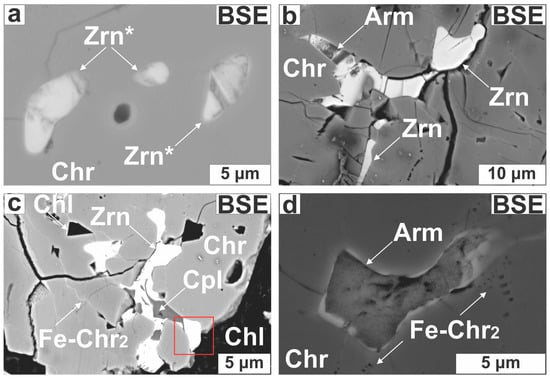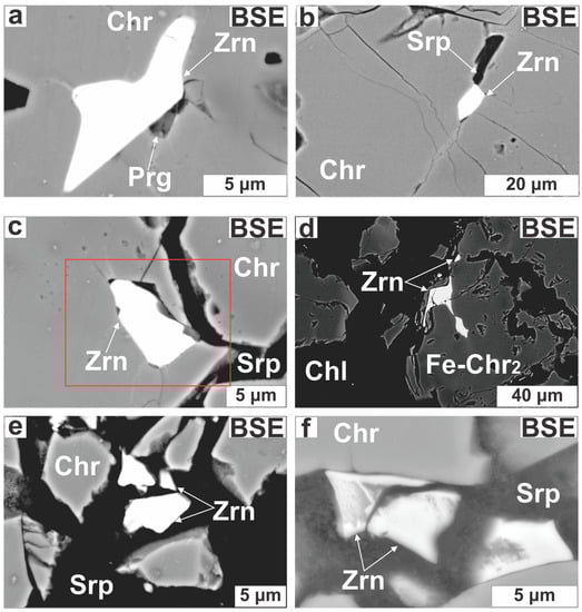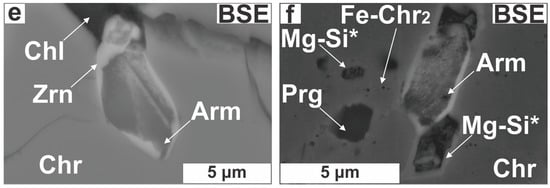 A total of 35 Zr-bearing silicate grains were discovered in 5 chromitite samples (Table A1 in the Appendix). Most of them (22 grains) were found distributed in narrow zones of about 400 × 200 μm2, each grain is smaller than 30 μm across; grain size distribution is lopsided because most particles (80%) range between 10 and 15 μm. Four different zirconosilicate minerals were recognized; namely, zircon, armstrongite, calciocatapleiite and a Zr-bearing Mg-silicate phase. Under transmitted light, the largest Zr-bearing silicate grains appear as dark grey to murky-brown and translucent crystals with low interference colors. They are located within the following structural sites: (i) unaltered Cr-spinel cores commonly along restored fissures or cracks filled with secondary silicates (Figure 6a–c); (ii) altered Cr-spinel boundaries (Figure 6d) and (iii) cataclastic zones cemented by serpentine (Figure 6e,f).