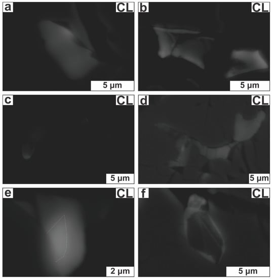 In CL images zircons appear to be dark and practically textureless, highly resembling metamict zircon (Figure 8a) [39,40]. Only in a few grains could some complex and irregular internal patterns be discerned (Figure 8b–e). All zircons have a strong BSE signal and suppressed CL emission (Figure 6, Figure 7 and Figure 8). The Ca-bearing Zr-rich silicate grains yielded weak BSE and CL intensities being virtually non-luminescent in accordance with their hydrous nature (Figure 8f) [39].