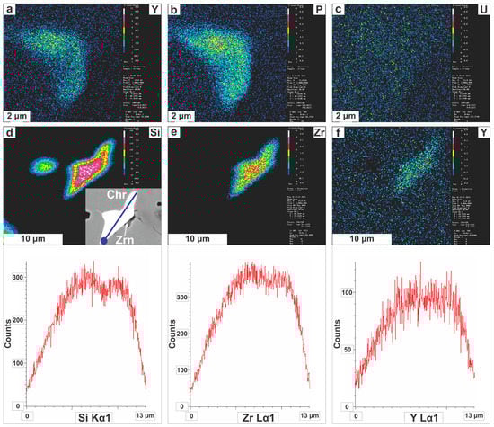 (a–c) Single-element (WDS) X-ray maps of the zircon grain originally illustrated in Figure 6a; (d–f) Single-element (WDS) X-ray maps of the zircon grain originally illustrated in Figure 7c (marked by the red square). Line scans are also shown for the zircon crystal depicted in Figure 6a, where the beginning of analyses is marked by the dark blue circle. Abbreviations are as in Figure 4 and Figure 6.