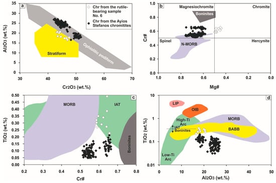 Pristine Cr-spinel composition in terms of: (a) Al2O3 vs. Cr2O3; (b) Cr# [= Cr/(Cr + Al)] vs. Mg# [= Mg/(Mg + Fe2+)]; (c) TiO2 vs. Cr# and (d) TiO2 vs. Al2O3 (wt %). Fields for podiform and stratiform chromitites are from [42]. Fields for spinel in equilibrium with N-MORBs and boninites in (b) are from [43]. Fields for Cr-spinel in equilibrium with MORBs, IATs and boninites in (c) are from [44]. Compositional fields in (d) are from [45]. Abbreviations: (N-)MORBS = (normal) mid-ocean ridge basalts, IAT = island arc tholeiites, BABB = back-arc basin basalts; OIB = ocean islands basalts, LIP = large igneous province (basalts).