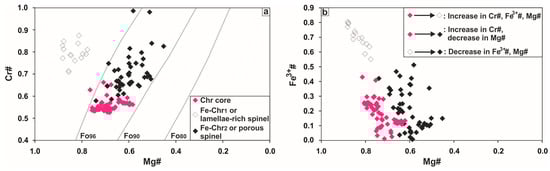 Variations of altered Cr-spinel in terms of: (a) Cr# vs. Mg#; (b) Fe3+# vs. Mg#. The composition of Cr-spinel is contoured at a nominal T of 1200 °C for olivine compositions from Fo80 to Fo96 [43]. Abbreviations as in Figure 5.