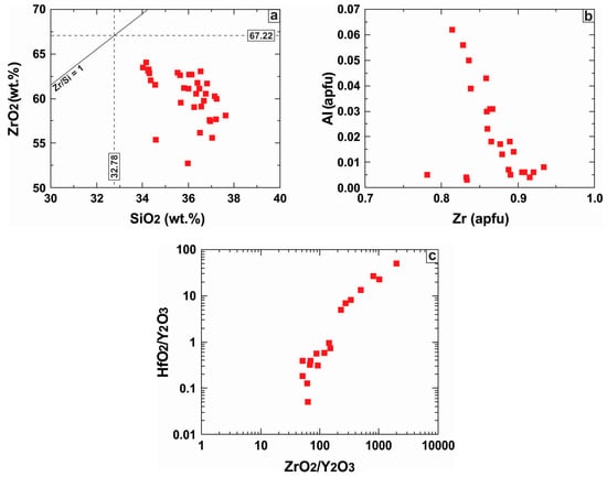 Zircon contains 52.71 to 64.03 wt % ZrO2 and 34.02 to 37.62 wt % SiO2 (34 spot EMPA-WDS analyses). This composition deviates from the ideal stoichiometric formula as ZrO2 content is low (Figure 13a). These zircon grains contain up to 3.46 wt % HfO2, which is within the range of HfO2 abundance for natural zircon (0.5–5.0 wt %) [46]. They also contain limited amounts of Y2O3 (≤1.21 wt %) and traces of P2O5 (≤0.43 wt %). The UO2 and ThO2 contents are quite low (≤0.28 wt % and ≤0.26 wt %, respectively) and the PbO content even lower (≤0.14 wt %). Common impurities include CaO, Al2O3 and FeOt.