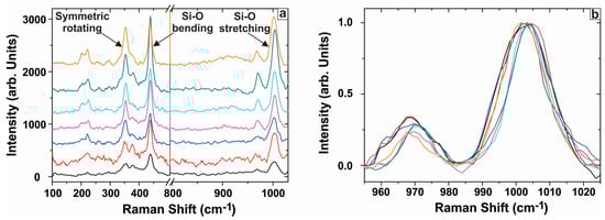 (a) Raman spectra in the wavenumber range of 100–1025 cm−1 for the studied zircons; (b) Spectra of zircons normalized to the height of the v3(SiO4) stretching mode at ~1008 cm−1.