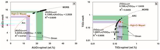 Plots of the calculated Al2O3 and TiO2 contents of the parental melts in equilibrium with chromitites. The MORB and Arc lines are from [53] using data on spinel-melt inclusions in MORB and arc lavas reported by [45,56]. The range of Cr-spinel and the calculated melt compositions from the chromitites of the shallow and deep mantle section in Oman [56] are shown for comparison. Only data of chromitite samples not associated with gabbroic intrusions were used for computation.