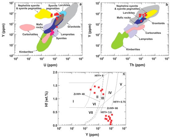 The Al3+ proportion in zircon was found to be negatively correlated with that of Zr4+ (Figure 13b). This probably implies that Al3+ for Zr4+ substitution in the dodecahedral site may be possible through a charge balance mechanism. In contrast, the HfO2/Y2O3 ratio is positively correlated with the ZrO2/Y2O3 ratio (Figure 13c) as it is expected when incorporation of Zr, Hf and Y in zircon is dominated by the typical xenotime-type coupled substitution [(Y3+ + REE3+) + P5+ ↔ Zr4+ + Si4+]. Selected zircon analyses are listed in Table A4 (see Appendix).