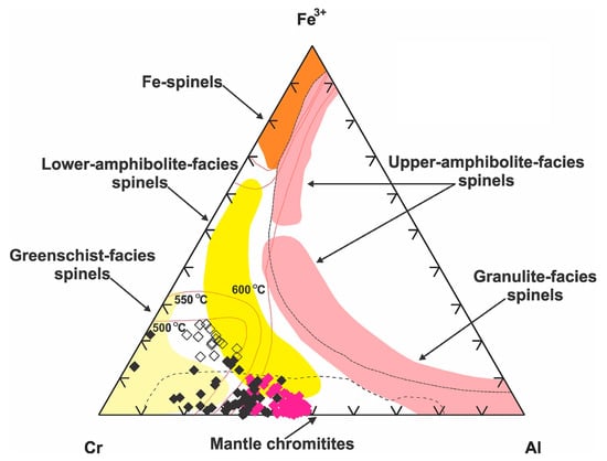 Depleted sections of old sub-oceanic lithospheric mantle may contain substantial amounts of chromian spinel (hereafter Cr-spinel) in the form of single but sometimes economically valuable deposits of Cr (chrome ores) (e.g., [1]). Chromitites in ophiolites are predominantly dispersed at the transitional boundary between the Earth’s crust and the mantle [2]. Despite their simple mineralogy, the mechanism that governs their genesis remains controversial. Interaction between mafic melts and peridotite wall rocks may change magma composition triggering Cr-spinel precipitation [3]. On the other hand, a growing body of work has concluded that focused flow and mingling of hydrous mafic magmas characterized by varying SiO2-activities within ‘dunite channels’ (e.g., [4]) might be essential for the genesis of chromitites [5]. The inferred parental melts of most chromitites are thought to have arc-related supra subduction zone (SSZ) signatures (e.g., [6]). However, the ‘coincidental’ discovery of chromitite seams in peridotites from ultra-slow mid-ocean ridges (MOR) sends a cautionary message about the possibility of chromitite formation even in typical ‘dry’ environments [7,8]. Furthermore, it has been demonstrated that magmatic assimilation of a hydrated mantle protolith at Moho-level depths may dramatically affect the chemistry of a mid-ocean ridge basalt-type (MORB) melt causing increase of Cr concentration into economic ores [9]. Regardless of their origin, ophiolitic chromitites are widely considered as ‘miniature time capsules’ retaining priceless information on petrological issues of crucial importance such as: (i) the nature of the upper mantle [10]; (ii) mantle melting and subsequent melt extraction and interaction with peridotites [11] and lastly; (iii) recycling of the oceanic lithosphere [12]. Furthermore, Cr-spinel is widely regarded as a sensitive petrotectonic indicator because its composition is controlled by mantle melting processes that are typical of various geotectonic environments (e.g., [1,3,5,6]). The fundamental role of Cr-spinel and chromitites in resolving large scale petrological matters is reflected in their potential use to probe the differentiation processes in our planet’s interior up to the Transition Zone (410–660 km) [13].