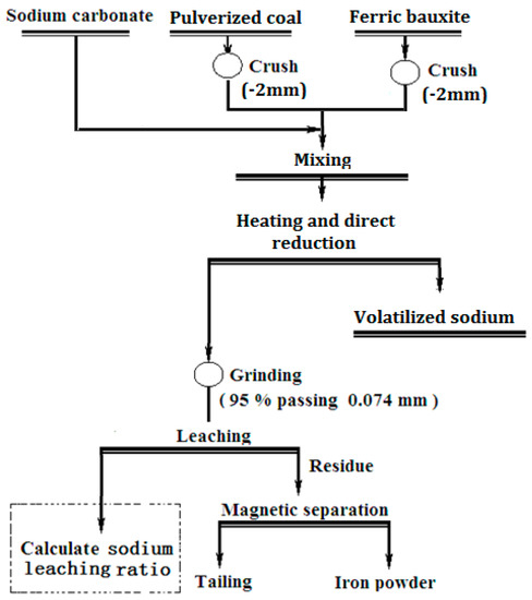 The leaching residues were transferred to magnetic separators, and the iron powder was isolated from tailing with a magnetic separation of 0.14 T. The entire flow chart adopted in the experiments is shown in Figure 1, but only the sodium leaching part was investigated in this study.