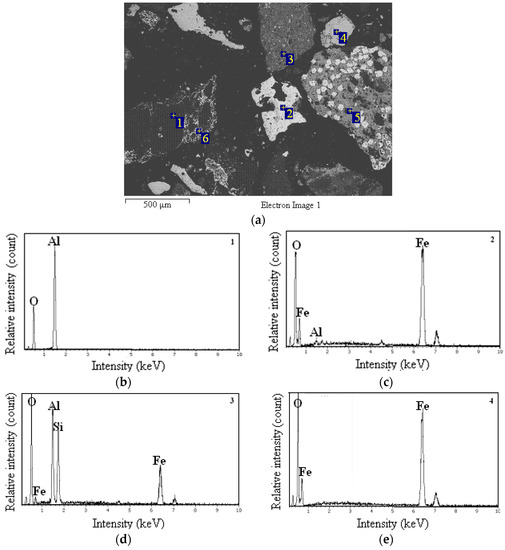 The ferric bauxite used was sampled from the Guangxi province of China. The chemical composition, SEM-EDS photos, and XRD image of the ferric bauxite adopted are presented in Table 1 and Figure 2 and Figure 3, respectively.