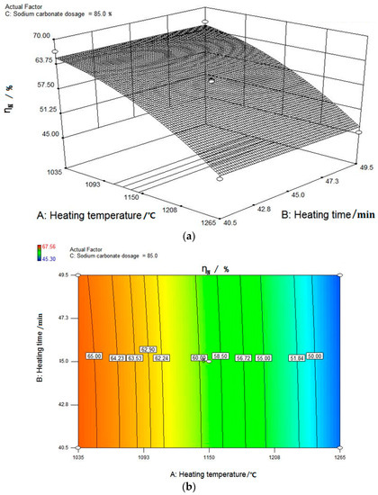 (a) Response surface of heating time–sodium carbonate dosage; (b) contour of heating time–sodium carbonate dosage plot.