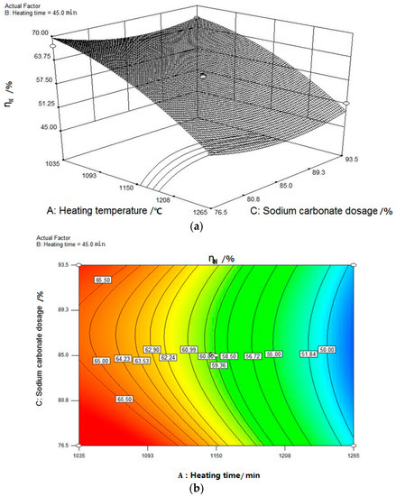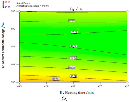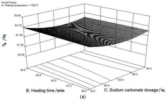 Figure 4, Figure 5 and Figure 6 show that the value gradients correlated with heating temperature is much sharper than that with sodium carbonate dosage and heating time. Exerting the minimal impact on ηN, the effect of heating time is negligible. Namely, the significance of the influencing factors of ηN can be arranged in descending order, as follows: heating temperature > sodium carbonate dosage > heating time.