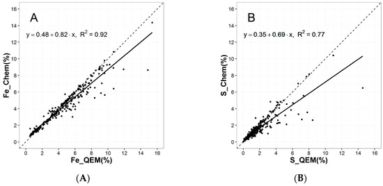 Scatter plots comparing chemical assays for Fe (A) and S (B) versus percentages calculated using QEMSCAN® mineralogy. The assays were done by atomic absorption spectroscopy and LECO® (LECO Corporation, Saint Joseph, MI, USA) for Fe and S, respectively. Dotted lines represent the 1:1 correlation line, whereas solid lines are linear regression fits.