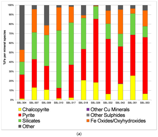 (a) QEMSCAN® Elemental deportment charts for Fe and (b) S for 10 randomly chosen samples. Sulfur percentage in particular is strongly associated with pyrite in the samples.