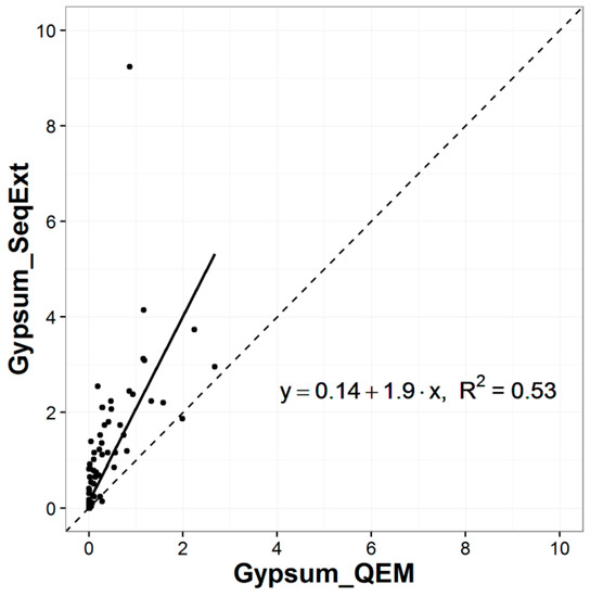 Scatter plot for percentages of gypsum calculated from sequential extraction results versus those detected by QEMSCAN® analyses for 2008 study. The dotted line represents the 1:1 correlation line, whereas the solid line is the regression fit.