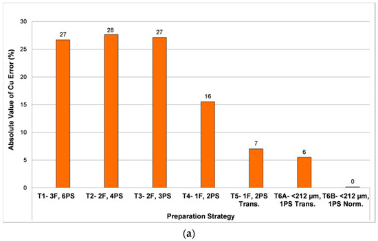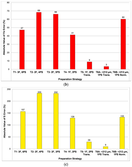 Average errors for (a) Cu; (b) Fe and (c) S calculated by calculating the difference between the QEMSCAN® results for each of the sample preparation tests vs. chemical assays, and then computing the average for all three samples. T1: three size fractions with a total of six polished sections; T2: two size fractions with a total of four polished sections; T3: two size fractions with a total of three polished sections; T4: no size division, original and duplicate polished sections prepared; T5: no size division, two transverse polished sections prepared; T6A: granulometric size reduction and preparation of one transverse polished section; T6B: granulometric size reduction and preparation of one traditional polished section.