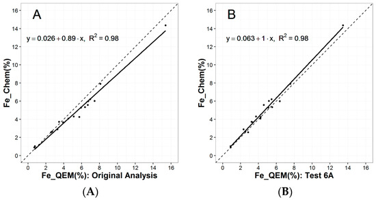 (A) Elemental conciliations for Fe for eighteen samples, comparing QEMSCAN® results vs. chemical assays by atomic absorption spectroscopy for the original QEMSCAN® results from 2008 and (B) the results obtained for the polished section prepared using the methodology from Test 6A, which involved sample particle size reduction and preparation of a transverse polished section.