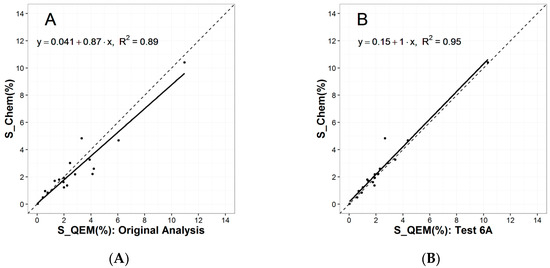 (A) Elemental conciliations for S for eighteen samples, comparing QEMSCAN® results vs. chemical assays by atomic absorption spectroscopy for the original QEMSCAN® results from 2008 and (B) the results obtained for the polished section prepared using the methodology from Test 6A, which involved sample particle size reduction and preparation of a transverse polished section.