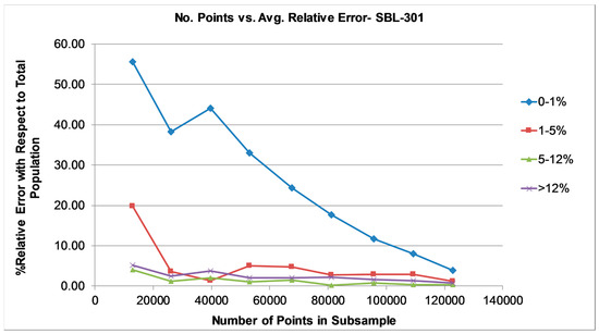 Given that the number of particles and analysis points demonstrate a perfect linear correlation (R2 = 1.00), the number of analysis points in each subset was plotted against the average relative difference for each of the four mineral percentage ranges for each of the subsets (10% of total particles, then 20%, 30%, etc.). Figure 9 shows an example of this exercise for sample SBL-301.
