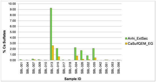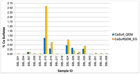 Comparison of the percentages of calcium sulfate minerals detected by QEMSCAN® for sections polished with water (CaSulf_QEM) vs. ethylene glycol (CaSulfQEM_EG).