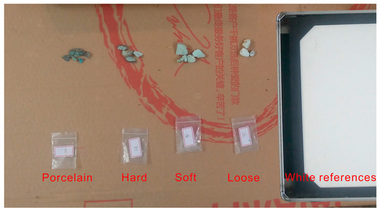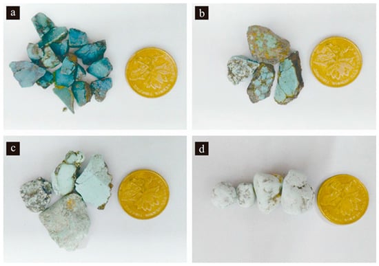 Spectrum measurement experiments of four turquoise samples were carried out using an ASDTM TerraSpec spectrometer (Analytical Spectral Devices Inc., Boulder, CO, USA), for which the spectral range is 350–2500 nm, and the spectral resolutions are 3 nm at 700 nm and 6 nm at 1400 nm and 2100 nm. The sampling intervals for the instrument are 1.4 nm between 350 nm and 1000 nm, and 2 nm between 1000 nm and 2500 nm. The signal-to-noise values are 9500 DN at 700 nm, 5000 DN at 1400 nm, and 800 DN at 2100 nm.