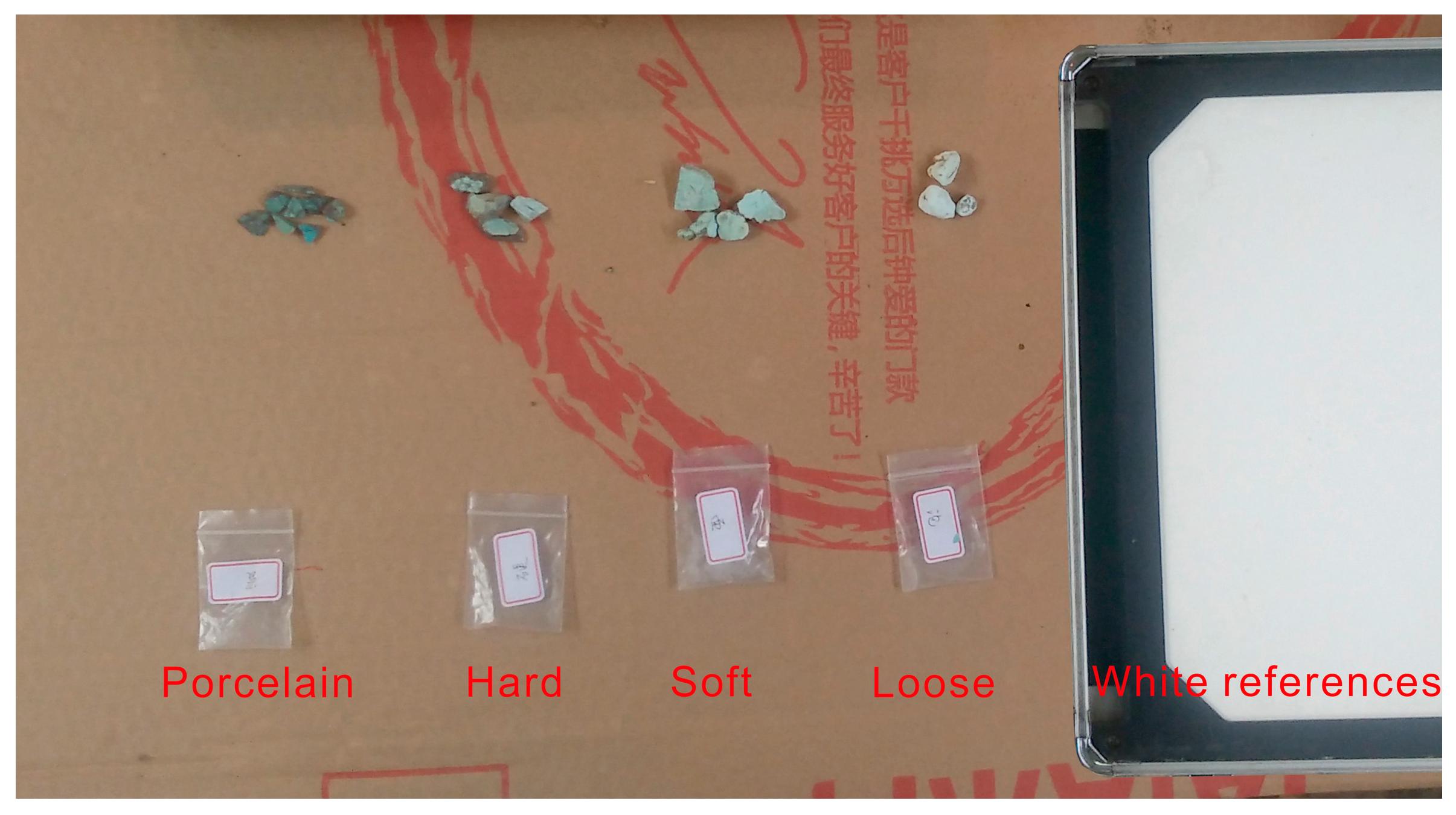 The ASDTM spectrometer was set up following the guidelines described in the Labspec4 user manual. An accessory light source (halogen lamp) was employed to measure the spectrum without sunlight. The ASDTM instrument was connected to a laptop and manipulated using the RS3 software package (Analytical Spectral Devices Inc., Boulder, CO, USA). Before the experiment, a white reference was introduced to optimize and calibrate the instrument. The reflectance of the white reference was automatically set to 1 by the RS3 software. Since the turquoise samples are usually in small particles, a black plastic plate with a coarse surface was used to make turquoise particles flat. During the experiment, the detector was closed to the turquoise particle level.