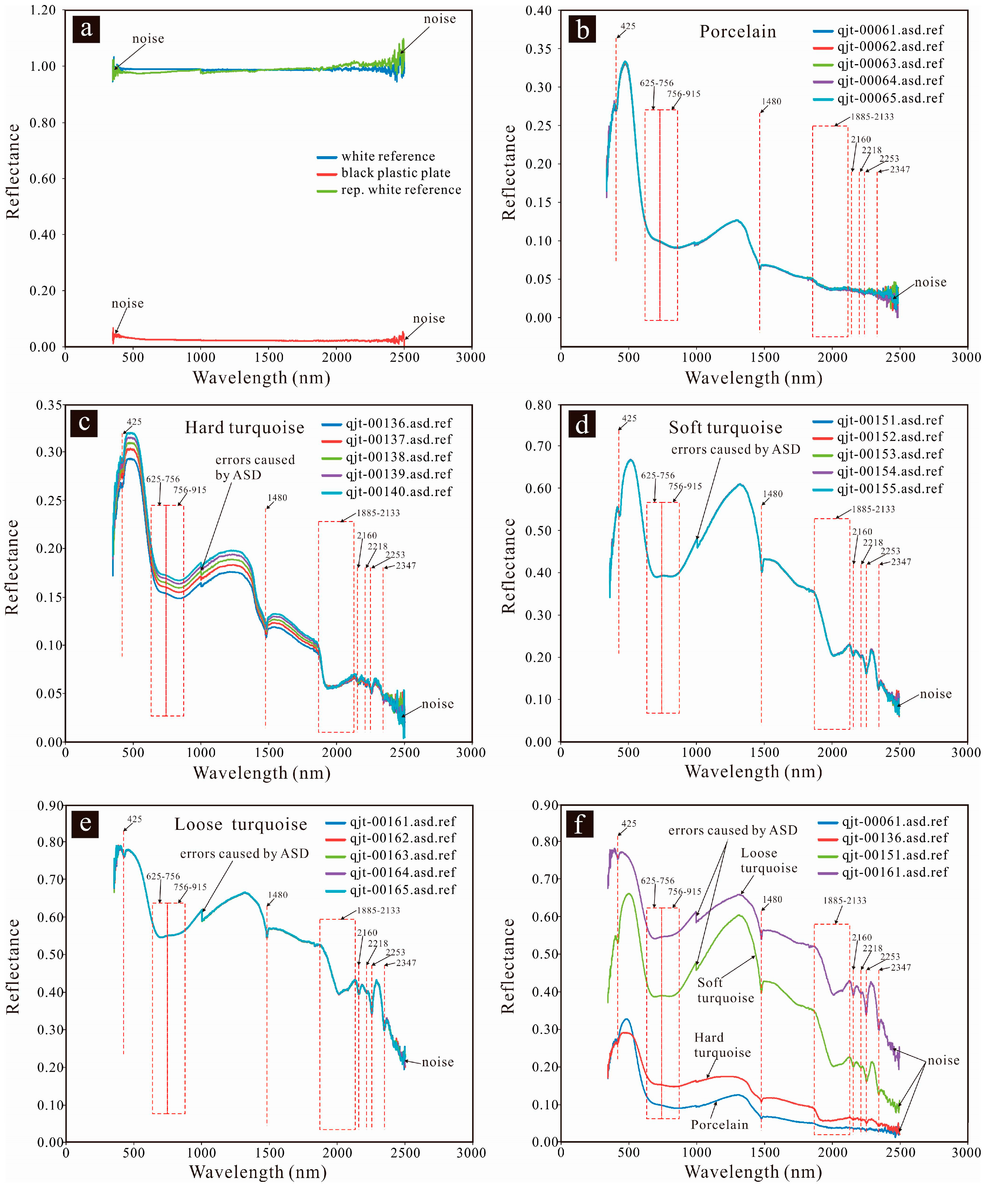 Figure 4b–e display the spectra of four types of turquoise samples. Five spectra were recorded for each sample. The five spectra have the same shape, suggesting that no variation of absorption features occurred during the measurement. The abrupt negative shift of the reflectance values at 1000 nm are not absorption features, but errors caused by different sensors in the ASD
