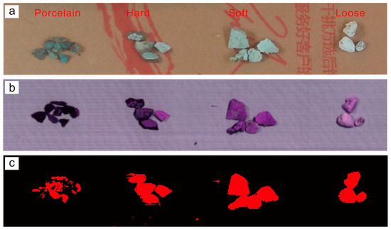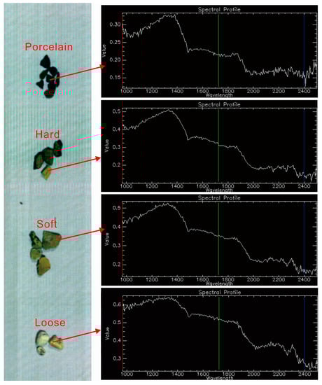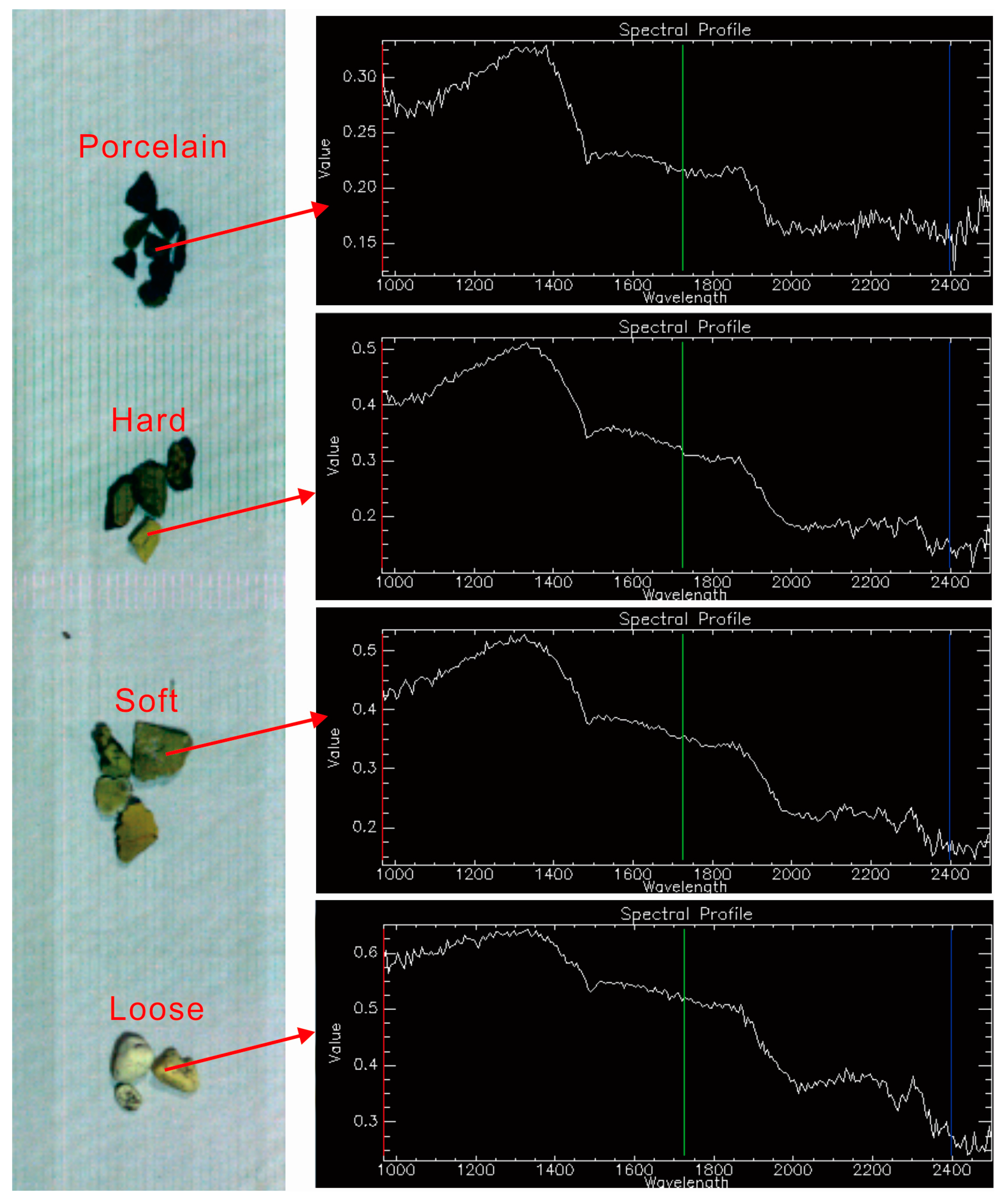 Figure 4f). For example, the hardest porcelain sample generally showed the lowest reflectance values and weak absorption features, while the softest loose turquoise sample had the highest reflectance values with apparent absorption features.